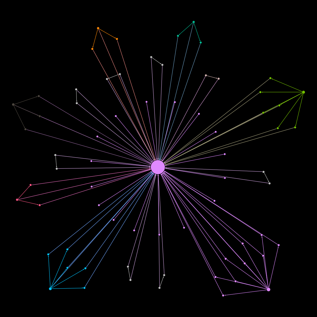 I created the second visualization using the Fruchterman Reingold layout to demonstrate the diverse relationship between the different words in The Cartographer Tries to Map a Way to Zion. Each word is customized to have a distinct color. I used the custom palette to color the nodes with browns and neutral tones in an attempt to mimic the cover image. But I ultimately decided to switch the palette to a variety of bright colors in order to illustrate the variety of words that make up this map as opposed to uniform colors that risk implying there is uniformity in navigating through a space or place.