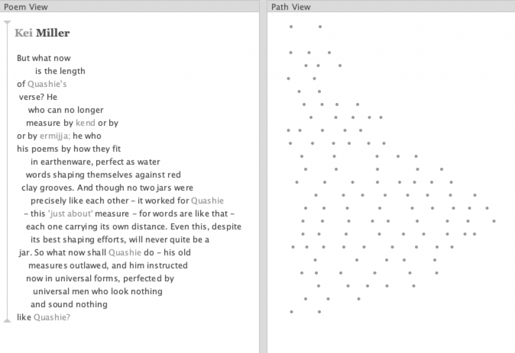 Instead I focused on a poem that also included Quashie, crafting poetry and rhythm. Miller’s “xvii” replicates a dub poem, which is a form of performance poetry that incorporates a beat, usually from a drum – this made it a good candidate for Poemage. After uploading the poem to the program, I decided to focus on assonance. Doing this sort of distant reading allowed me to see a sonic pattern; I noticed the lines that connected words with an “ae” sound.