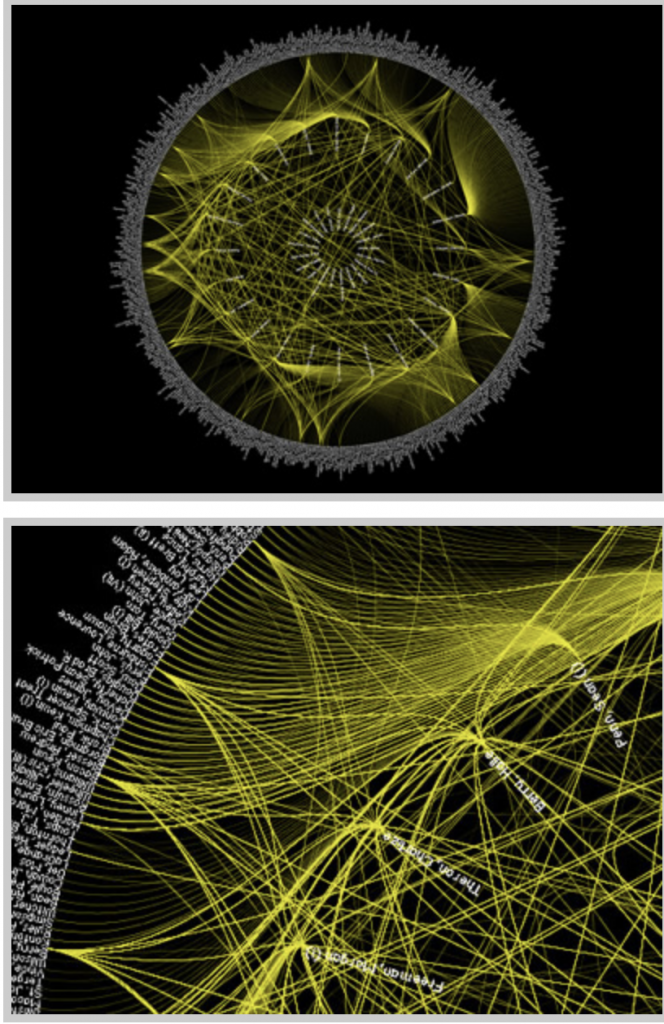 Lima states, network visualization is “a potential visual decoder of complexity, the practice is commonly driven by five key functions: document, clarify, reveal, expand, and abstract” (Lima 80). I wanted to document the potential relationships within my rowing team on the attributes of Name, Graduation Year, Home State, Major, and Sport Team. To clarify the data I played with the different attribute filters and partition coloring. By doing this, I revealed that there is a very strong relationship between Winter, Martinez, and Keating, which could be potentially be expanded in a larger, more focussed project, and possibly use it as an abstract representation for some larger connection.